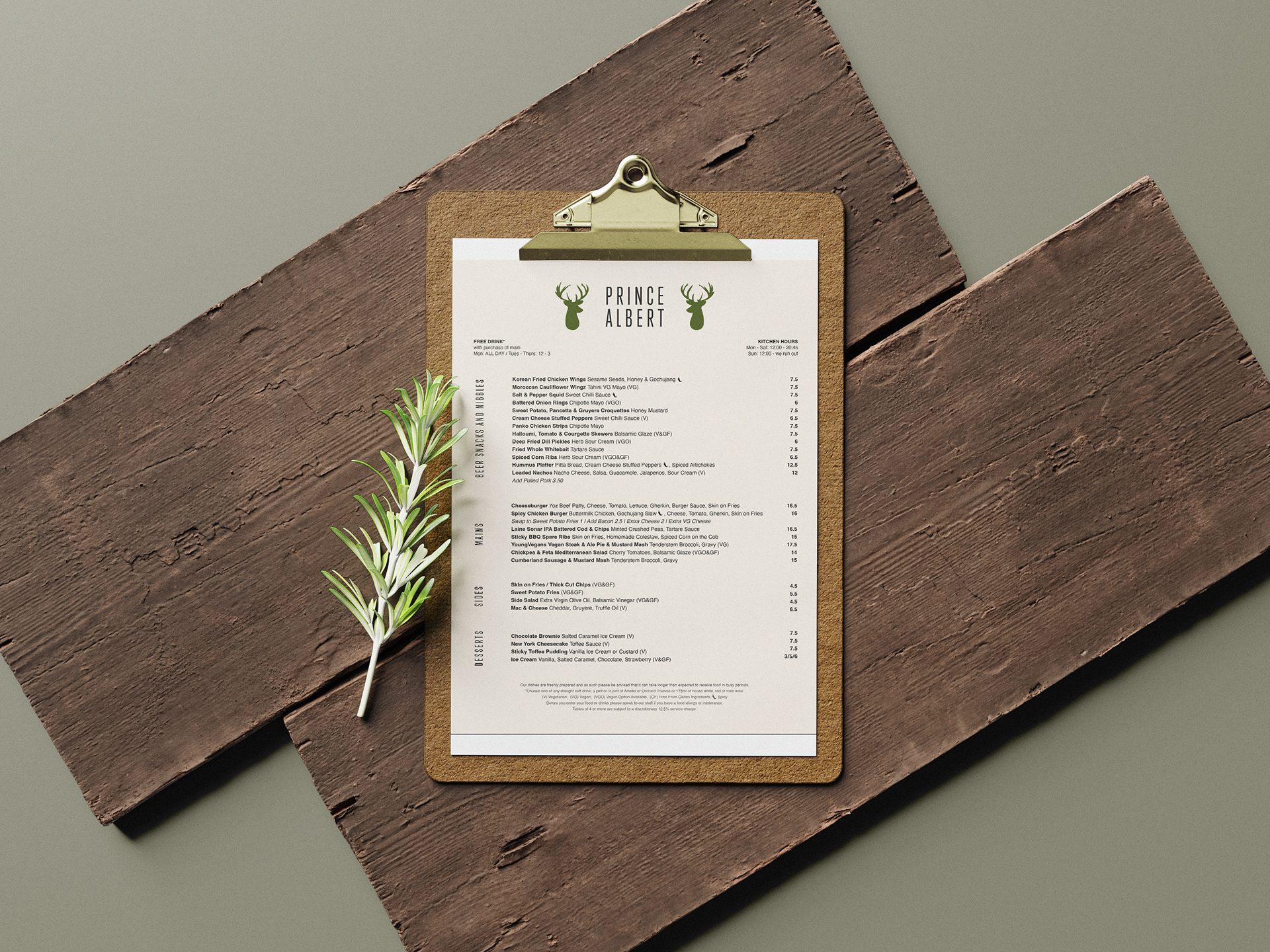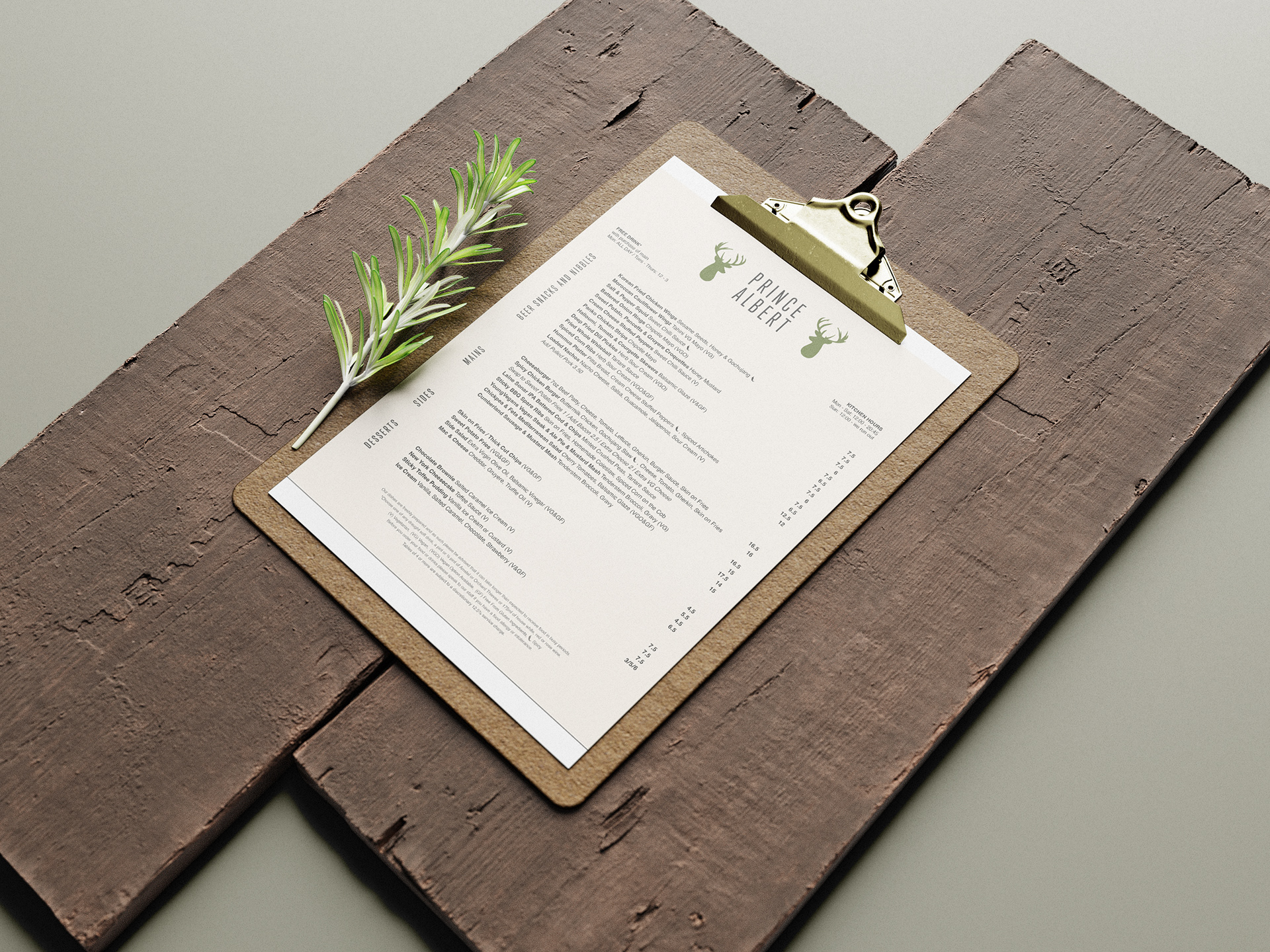 Menu design and brand identity for The Prince Albert in Camden Town, London.